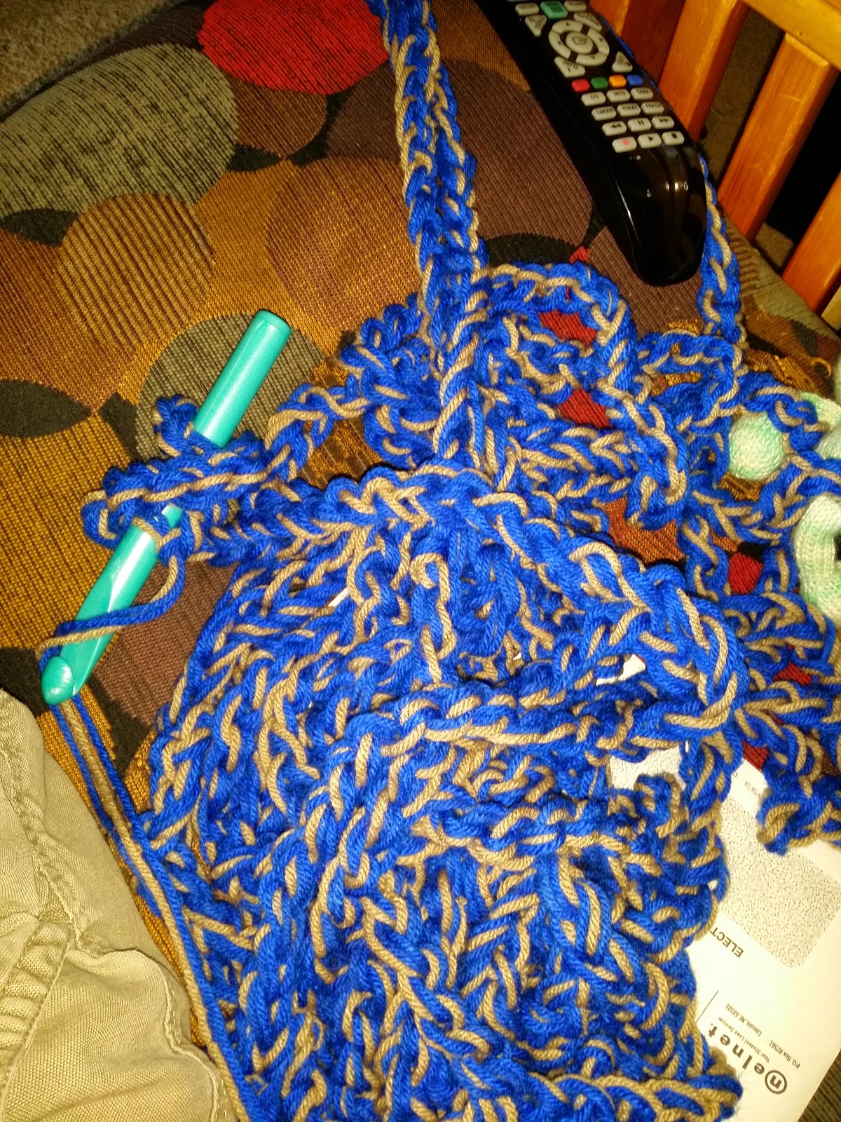Also, the yarn. Three strands of Caron 1lb held together and chained with a Q hook. BORING but important. I'll be getting more colours eventually since this will completely burn my stash of acrylic. I have some other acrylics that I plan on turning into yarn this way as well. This will be one hell of a blanket!